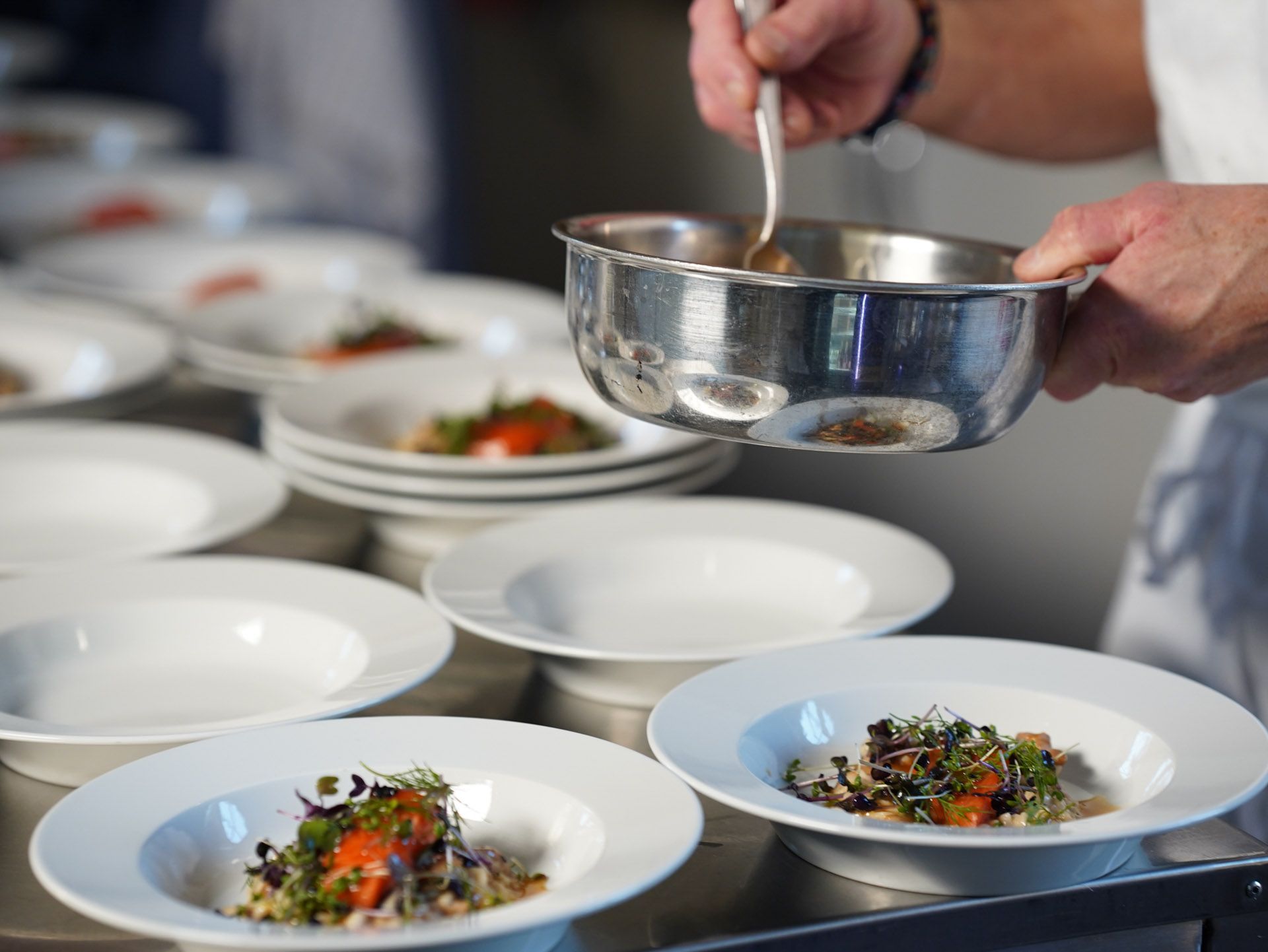Når menyen er bestemt setter vi viner til den. Vi har til enhver tid flere gode og spennende alternativer på lager. Våre folk kjenner godt til de forskjellige viners karakter, og smakssetter maten slik at vi får frem de aller beste kombinasjonene.